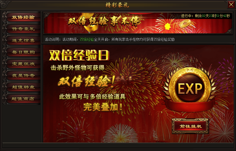 活动期间,双倍经验全天开启,所有玩家击杀怪物均可获得双倍经验奖励,还能与多倍经验道具完美叠加哦!