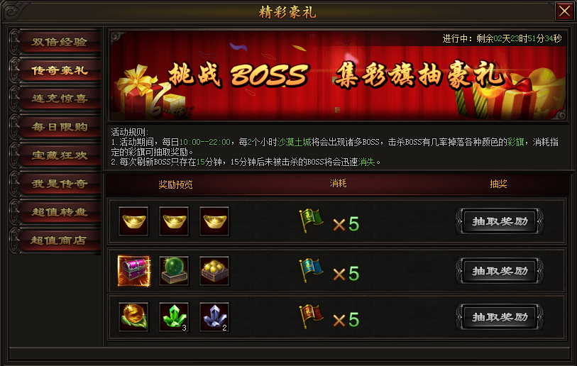 1.活动期间,每日10:00~22:00,每2个小时沙漠土城将会出现诸多BOSS,击杀BOSS将有几率掉落各种颜色的彩旗,使用彩旗可抽取丰厚的奖励。