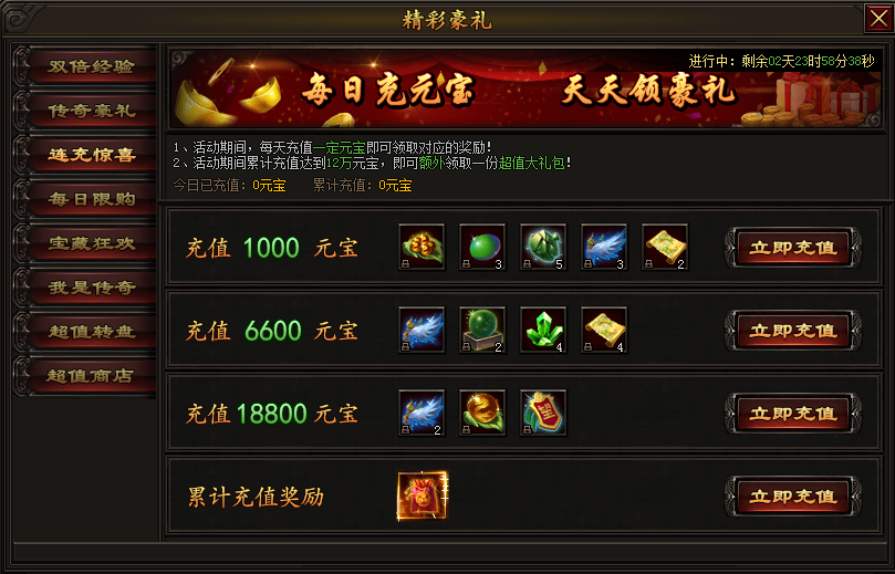 1.活动期间,每天充值指定数量的元宝,即可领取对应的奖励回馈,即充即得。