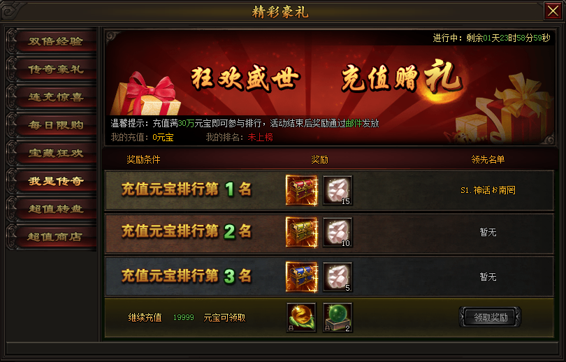 活动期间,累计充值达到30万元宝,即可参与充值排名,前三名可获得稀有装备奖励。