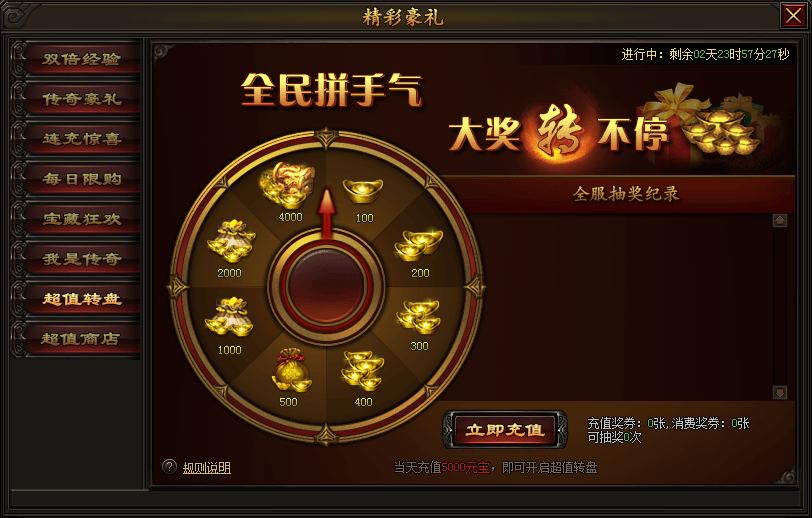 每充值2000元宝和消费2000元宝,都能分别获得1张充值奖券和消费奖券。