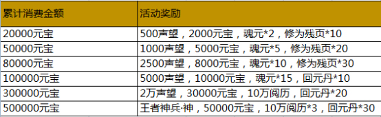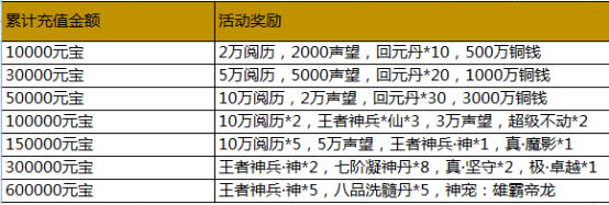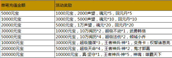 活动内容:活动期间,游戏内充值活动,玩家单笔充值一定金额,即可获得相应的充值奖励。(单笔充值奖励只计算充值元宝最大值,可以单笔重复充值重复领取)