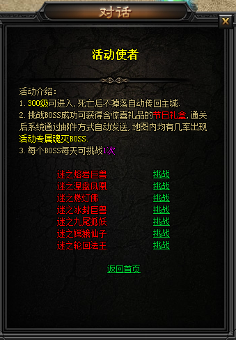 活动期间可在活动使者处可选择各类BOSS进行挑战,挑战成功可获得【节日礼盒】,内含精美礼品。