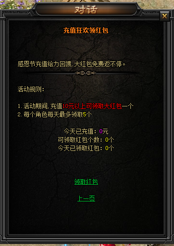 感恩节充值给力回馈,大红包免费返不停,活动期间充值10元以上可领取大红包一个,每个角色每天最多领取5个哦。