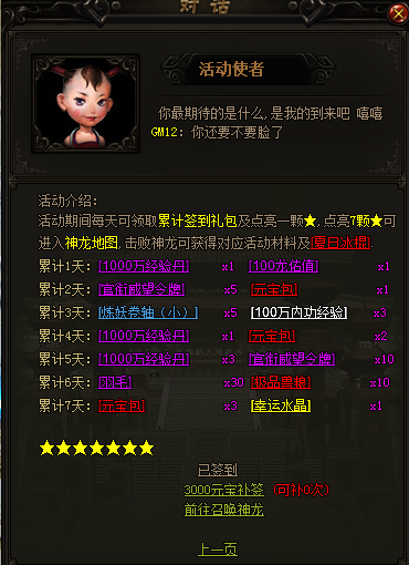活动期间, 连续登陆游戏可领取累计签到礼包和点了一颗星, 签到7天点亮7星可击杀神龙实现愿望。