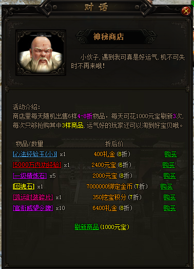 神秘商店惊现主城,商店里每天随机刷新6样物品4-8折低价出售,每天可花1000元宝刷新3次,每次只够抢购其中3样折扣商品,运气好的玩家还可以淘到好宝贝哦。