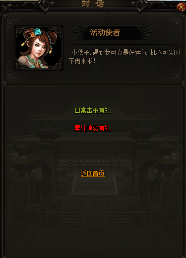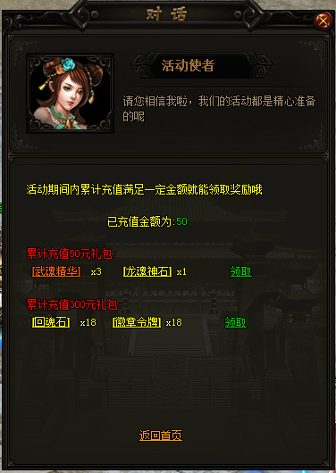 活动期间累计消耗元宝数,积分数,累计击杀日常活动BOSS达到要求可领取回魂石,徽章令牌,龙魂神石等丰厚奖励。