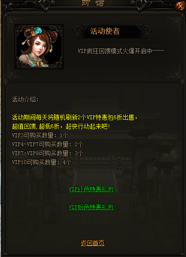 活动期间活动使者处每天将随机刷新2个VIP特惠包,超低6折起,VIP等级越高,可购买数量越多,折扣越低。