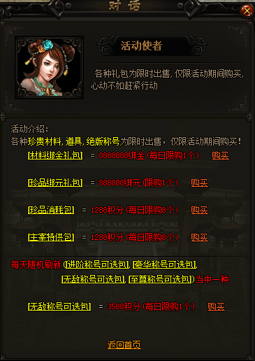 活动期间,活动礼包(含绑元绑金类)还同时间全面上架包括全力帮助您游戏更加舒畅开怀。各种珍贵材料,道具,绝版称号为限时出售,珍稀材料随手得,仅限活动期间购买,一定不要错过哦!