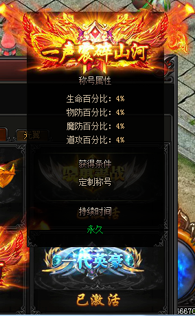 Ø 三、玩家累计充值(活动3天累计)达到50000RMB,可以自己选四至六个字-带特效定制称号,全属性增加4%。(定制称号在活动结束后统一提交制作,延后发放;活动期间,每个玩家仅能定制一个4%称号)